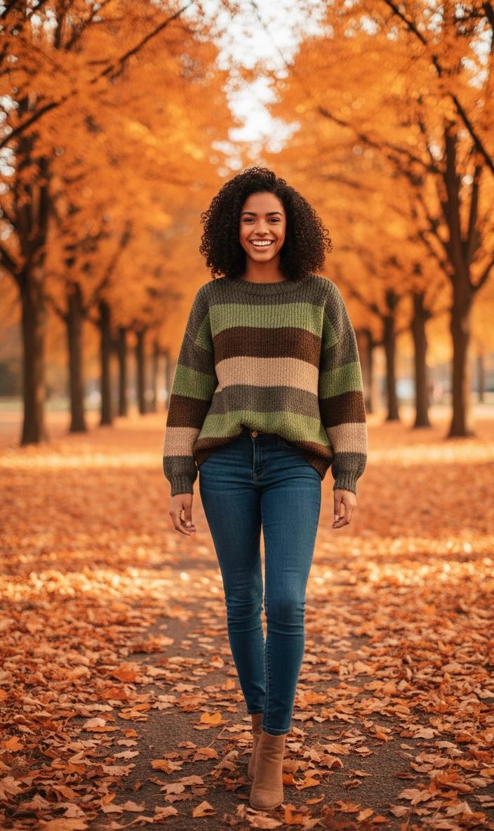 Questo è un maglione a righe caratterizzato da una palette di colori terrosi e naturali, perfetta per la stagione autunnale e invernale.